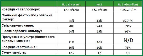 Також про цю властивість вказує Коефіцієнт затінення, який нижче на 4% від склопакета №2 і на 19% від склопакета №3.